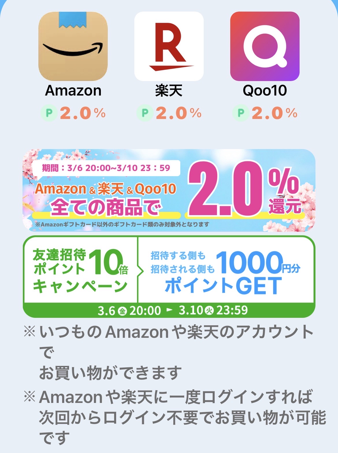 3/10㈫までのAmazon、楽天、Qoo10の買い物で、通常0.5%還元のところが2%還元キャンペーンになってます! 税込2,200円分以上の買い物をすると1,000円分のポイントがもらえます。